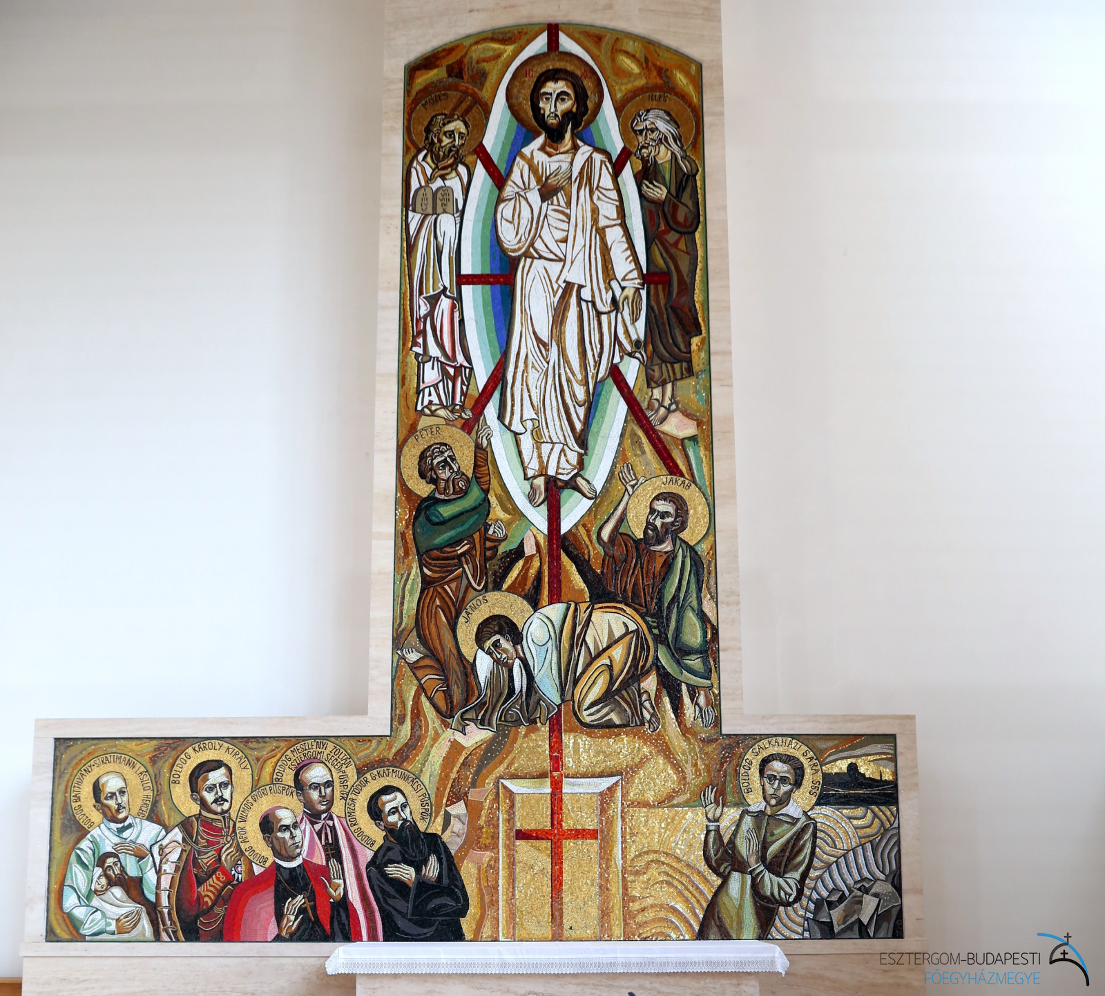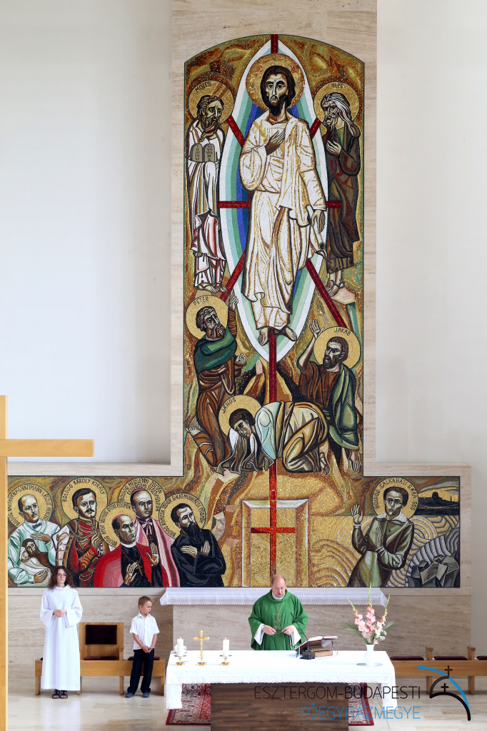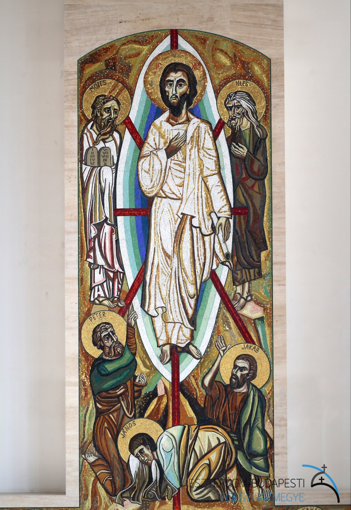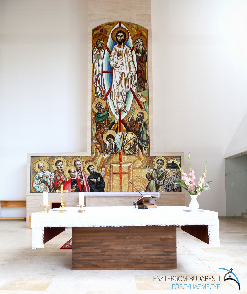 Az oltárba Szent Bonifác és Szent Kelemen egy-egy ereklyéje került, a szentélyben található ereklyetartóban pedig Sára testvér vezeklőövét helyezték el. A mozaik oltárkép, Urunk színeváltozását jeleníti meg Mózessel, Illéssel, valamint Péter, Jakab és János apostolokkal. Az alkotás Boldog Batthyány-Strattmann László, Boldog IV. Károly király, Boldog Romzsa Tódor, Boldog Meszlényi Zoltán, illetve Boldog Salkaházi Sára testvér portréját is ábrázolja. A mozaikot Puskás László görög katolikus pap, festőművész készítette, és 2010 május 9-én Erdő Péter bíboros áldotta meg.